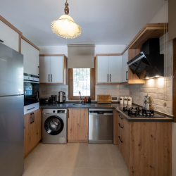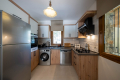 Die offene Küche schließt sich am Wohnzimmer an. Neben einem Gasherd, Backofen, Kühlschrank, Spülmaschine auch weitere Küchengeräte, stehen auch Sandwichmaker oder Teekocher zur Verfügung. Die Elektrogeräte sind allesamt von Siemens und entsprechend hochwertig. Auch Utensilien, wie Töpfe, Pfannen, Besteck, Teller usw. sind natürlich vorhanden. Die Küche hat einen Essensbereich mit 4 Sitzplätzen
