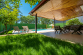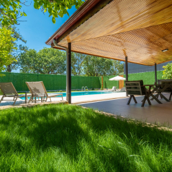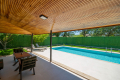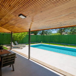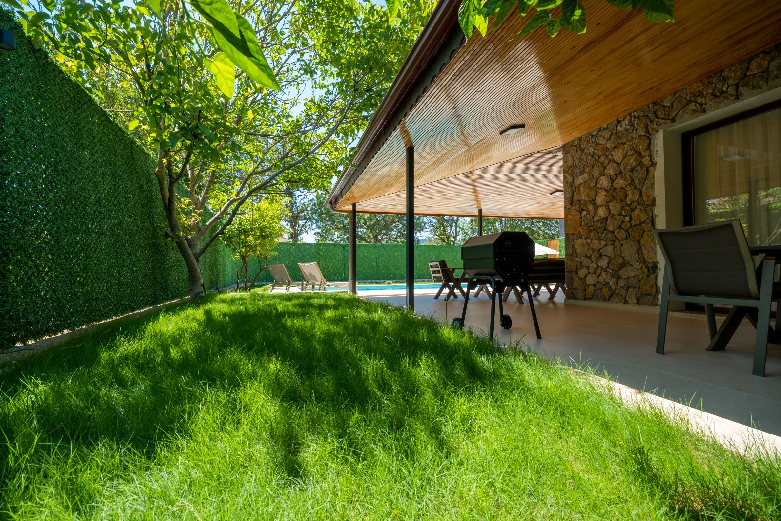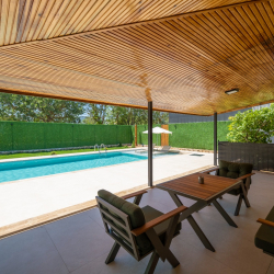 Im Außenbereich befindet sich neben dem Pool eine großzügige Ess- und Sitzgelegentheit zum Essen und Entpannen. Außerdem bietet der Außenbereich auch einen Grill für das zubereiten eines leckeren Barbeques. Zudem gibt es auch Liegen und Sonnenschirme, um sich von der Sonne verwöhnen zu lassen.