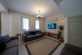 Ein geräumiges Wohnzimmer mit offenem Essbereich empfängt Sie im Inneren des Hauses. Zwei Sofas laden Sie in der Kaminecke zum Entspannen, Lesen oder Fernsehen (Smart TV) ein. Das Wohnzimmer hat direkten Zugang zur Außenanlage.