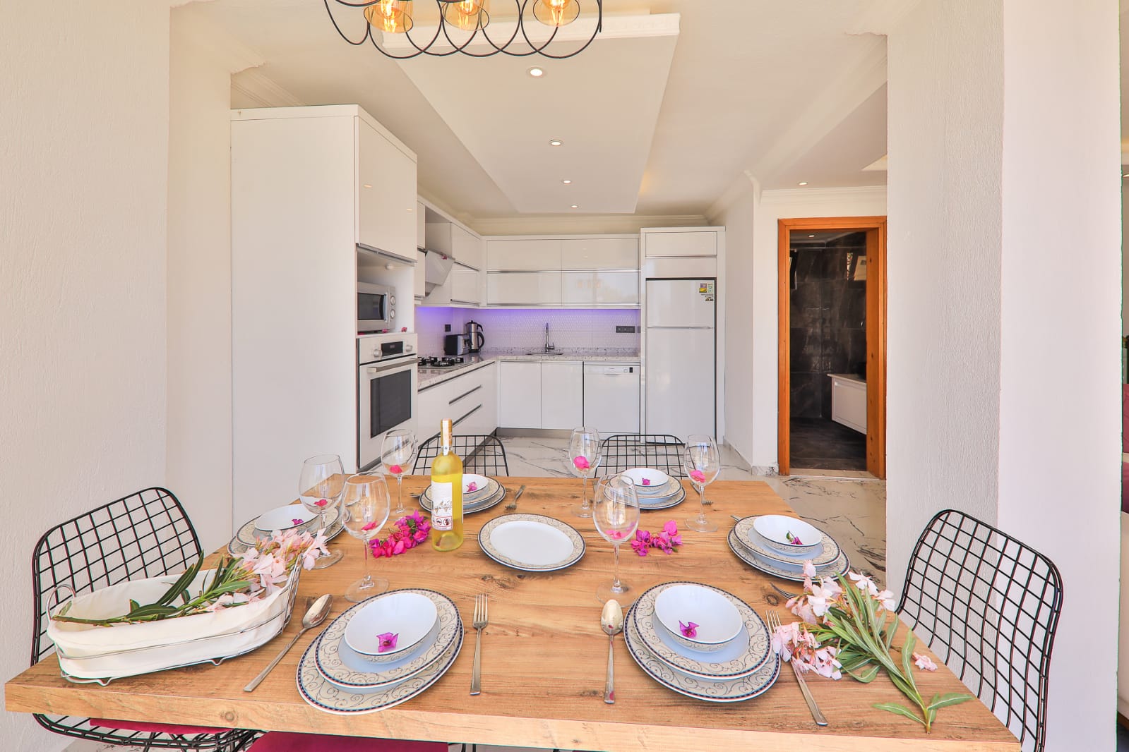 Die offene Küche befindet sich in sichtweite des Pools und verfügt neben einem Gasherd, Backofen, Kühlschrank, Spülmaschine auch weitere Küchengeräte, wie z. B. einen Sandwichmaker oder Teekocher. Auch Utensilien, wie Töpfe, Pfannen, Besteck, Teller usw. sind natürlich vorhanden.